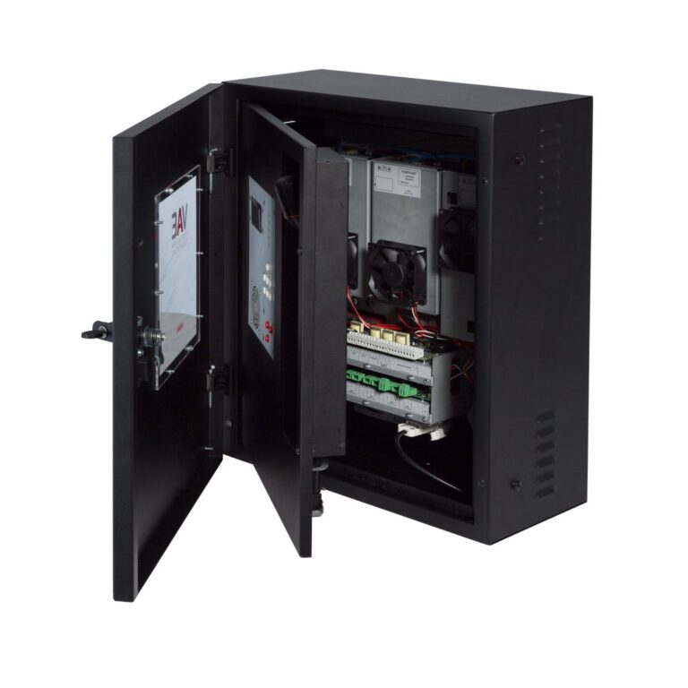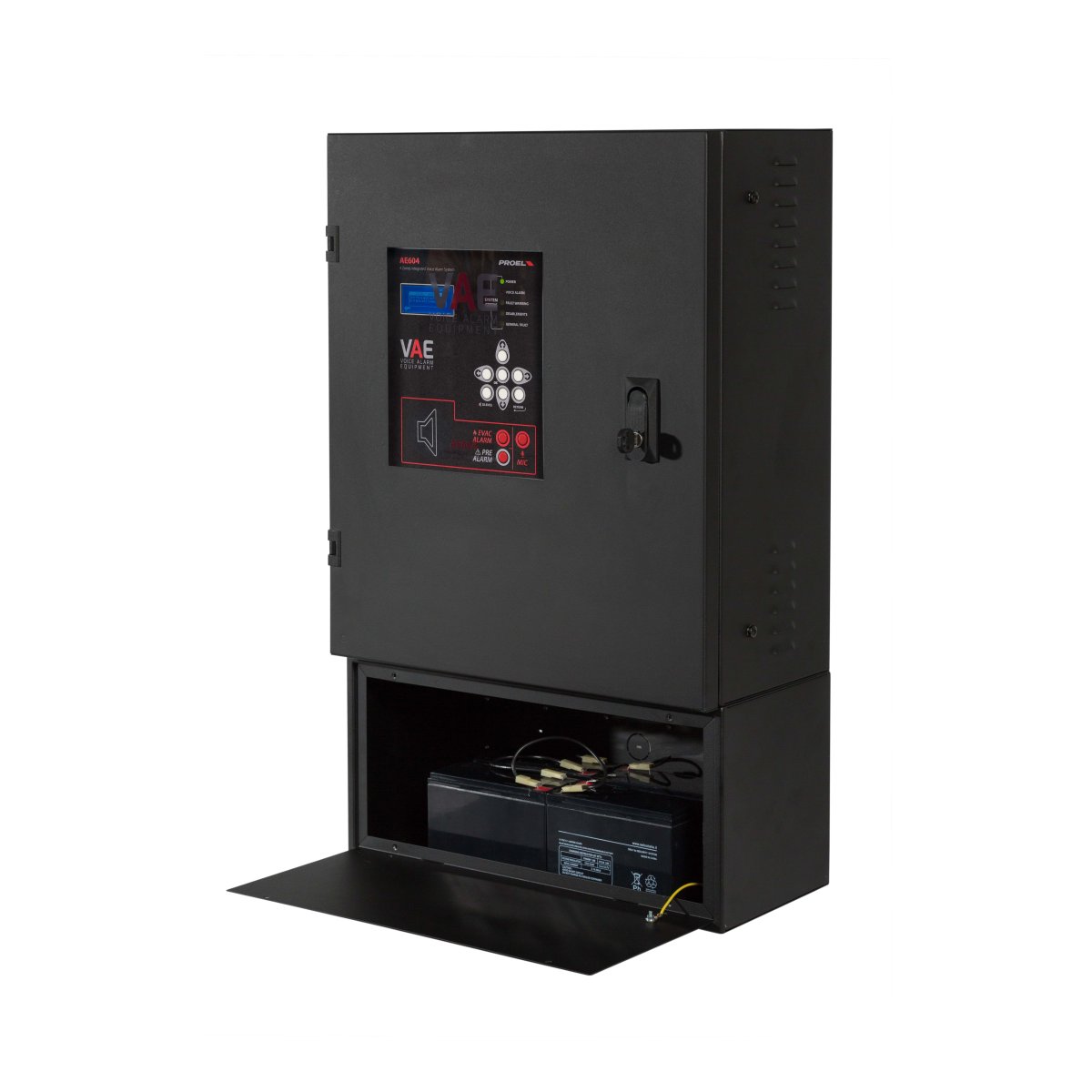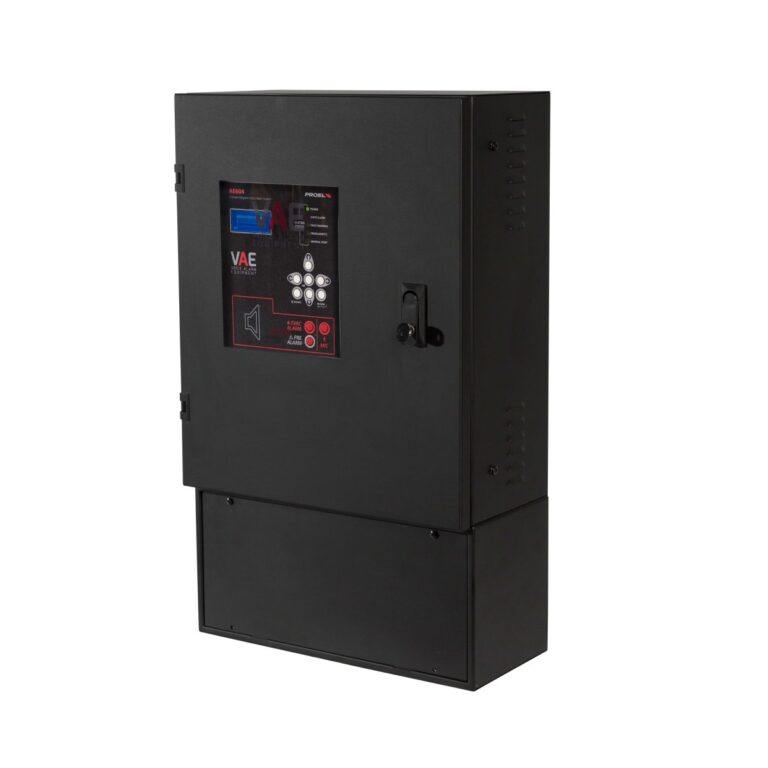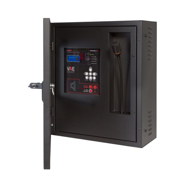 Sistema di allarme vocale All-In-One conforme EN54-16 con circuito di ricarica e test conforme EN54-4 da fissaggio a parete. Sistema a 4 zone su linea ridondata con amplificatore con funzione di riserva. Due amplificatori in classe D “Pure Path”™ 300W+300W (600W totali) @ 100V su linea altoparlanti ridondante (A + B). Il sistema non necessita di resistenza di fine linea. Il sistema garantisce prestazioni complete a piena potenza anche con alimentazione di backup. Circuito di processamento mediante DSP; ingresso musica di sottofondo bilanciato e isolato, ingresso microfonico isolato dotato di alimentazione phantom 48Vdc selezionabile e attivazione della priorità mediante contatto; ingresso monitorato per postazioni di chiamata d’emergenza remote; pannello frontale equipaggiato di altoparlante monitor, microfono PPT di emergenza monitorato, tasti di invio diretto dei messaggi, tasti di navigazione, ampio display a matrice di punti LCD. Uscita di linea; messaggi audio memorizzabili su uSD 16 bit 48Khz: 8 messaggi di uso generale con attivazione da contatti di ingresso dedicati o da scheduler incorporato, 8 contatti monitorati per attivazione annunci di emergenza. N°4 batterie 12Vdc. 18Ah non incluse.