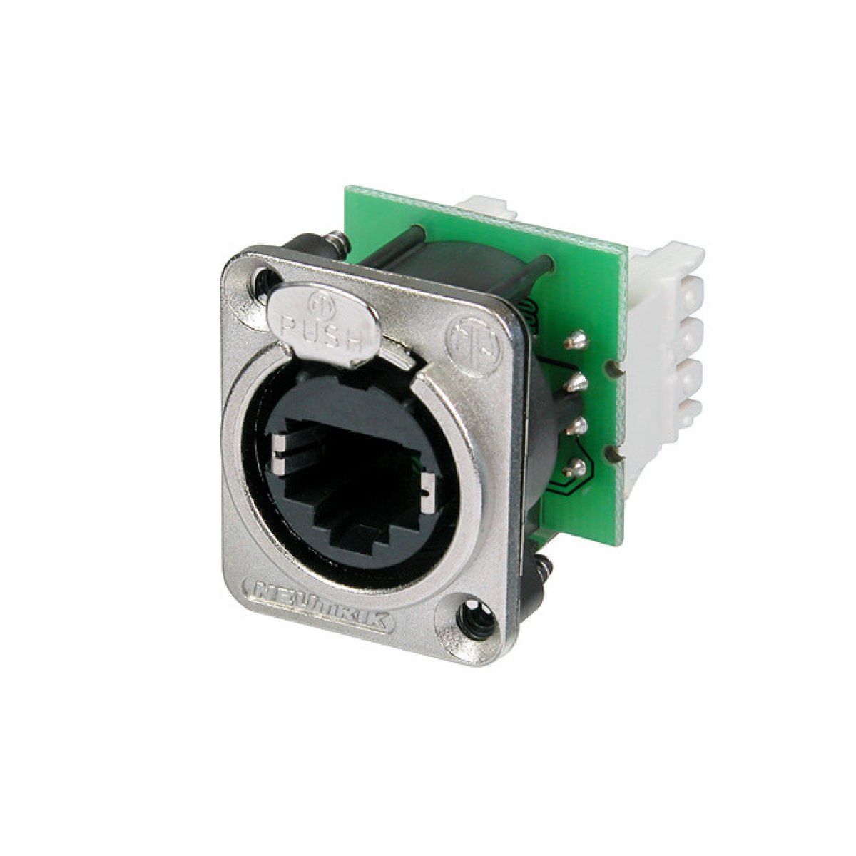 Presa da pannello Neutrik RJ45 per la trasmissione dati (sia 10Base-T sia 100Base-T) in ambienti estremi. Utilizzato per tutti i cavi CAT 5, questo connettore viene utilizzato anche per il protocollo luci DMX. Provvista di tasto di PUSH, contatti orizzontali per connessioni dirette con cavo CAT 5. NE8FDVY110