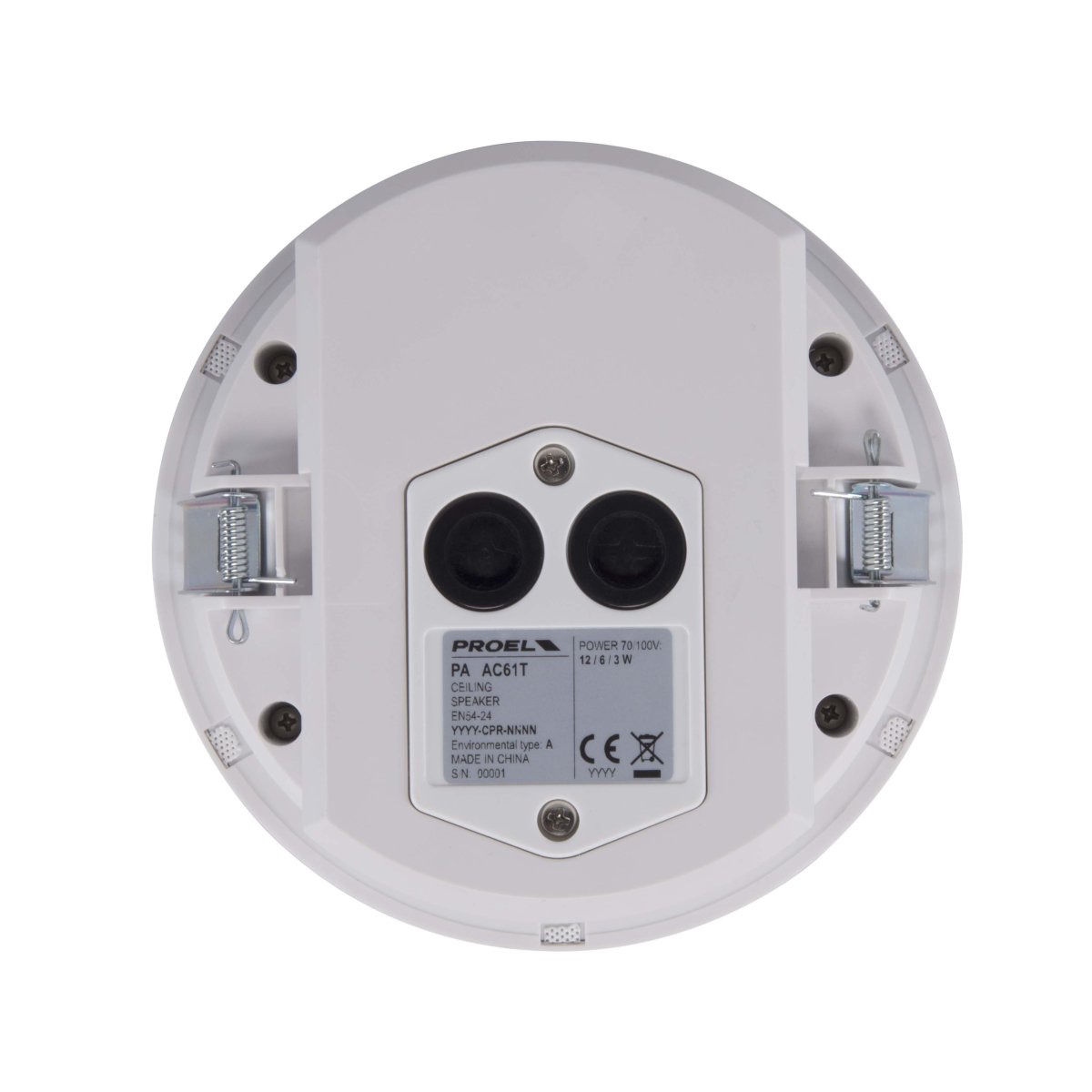AC61T include un trasformatore per operare in sistemi a tensione costante 100V e 70V con tre diversi livelli di potenza. Il cabinet è chiuso da un coperchio in materiale plastico ignifugo che sigilla il vano altoparlanti. In conformità alla normativa EN 54-24:2008, AC61T incorpora un terminale in ceramica e un fusibile termico ed è quindi adatto per l’utilizzo in applicazioni di allarme vocale.