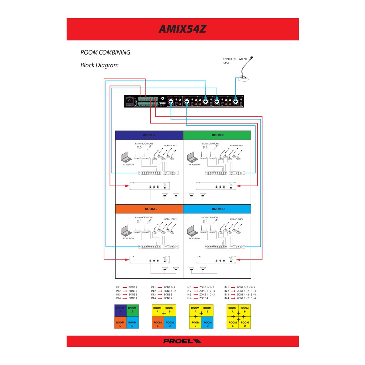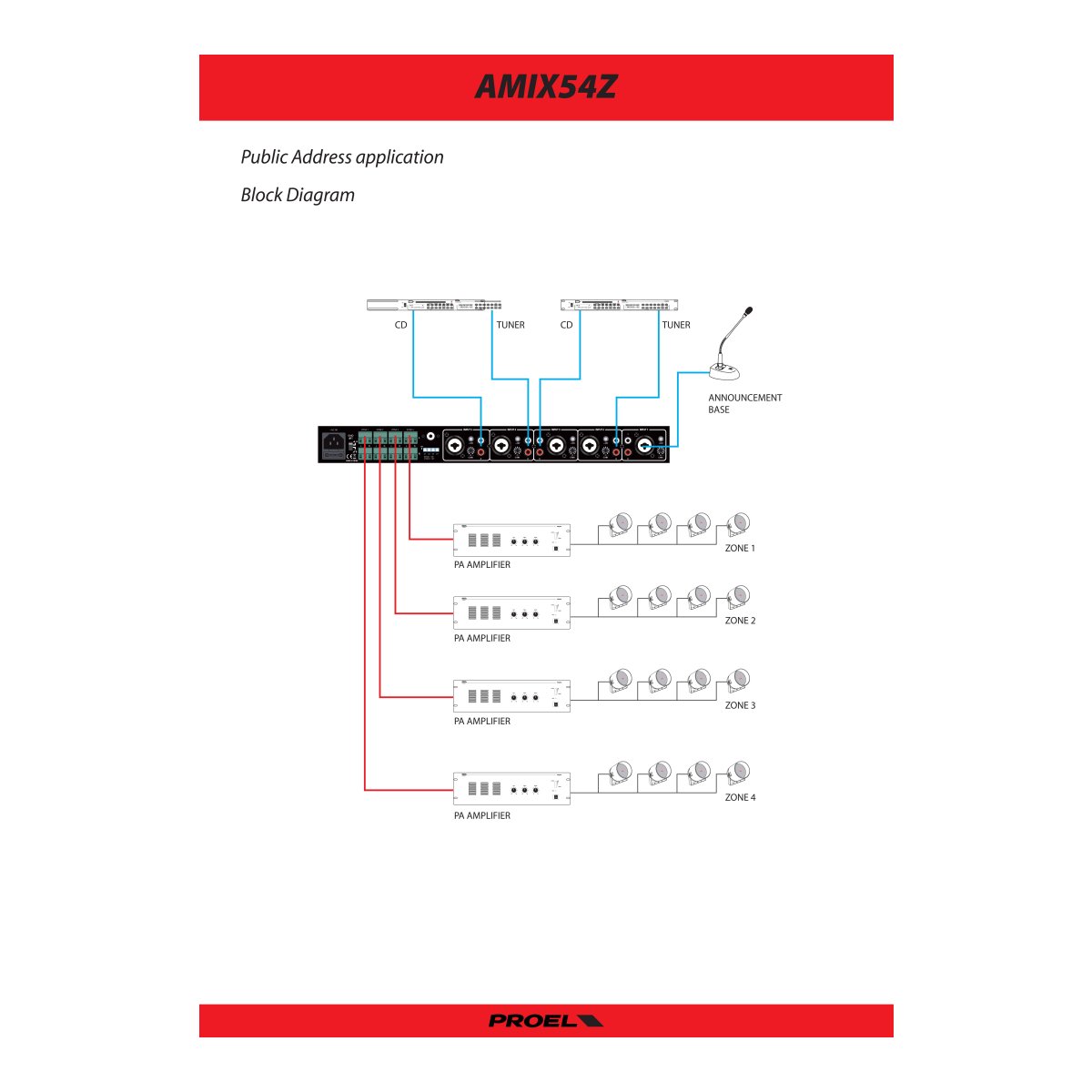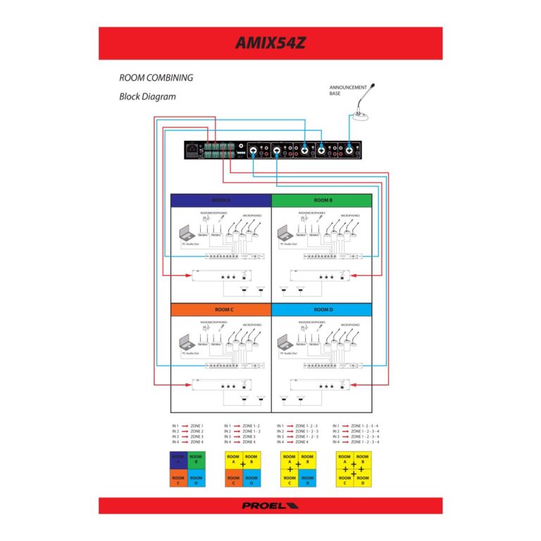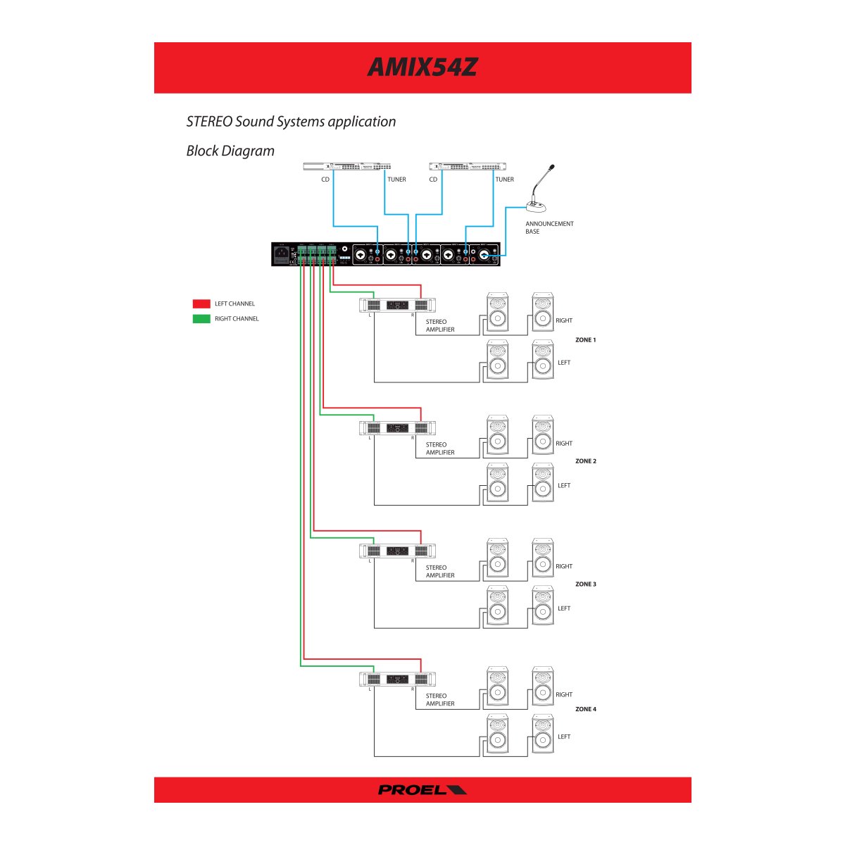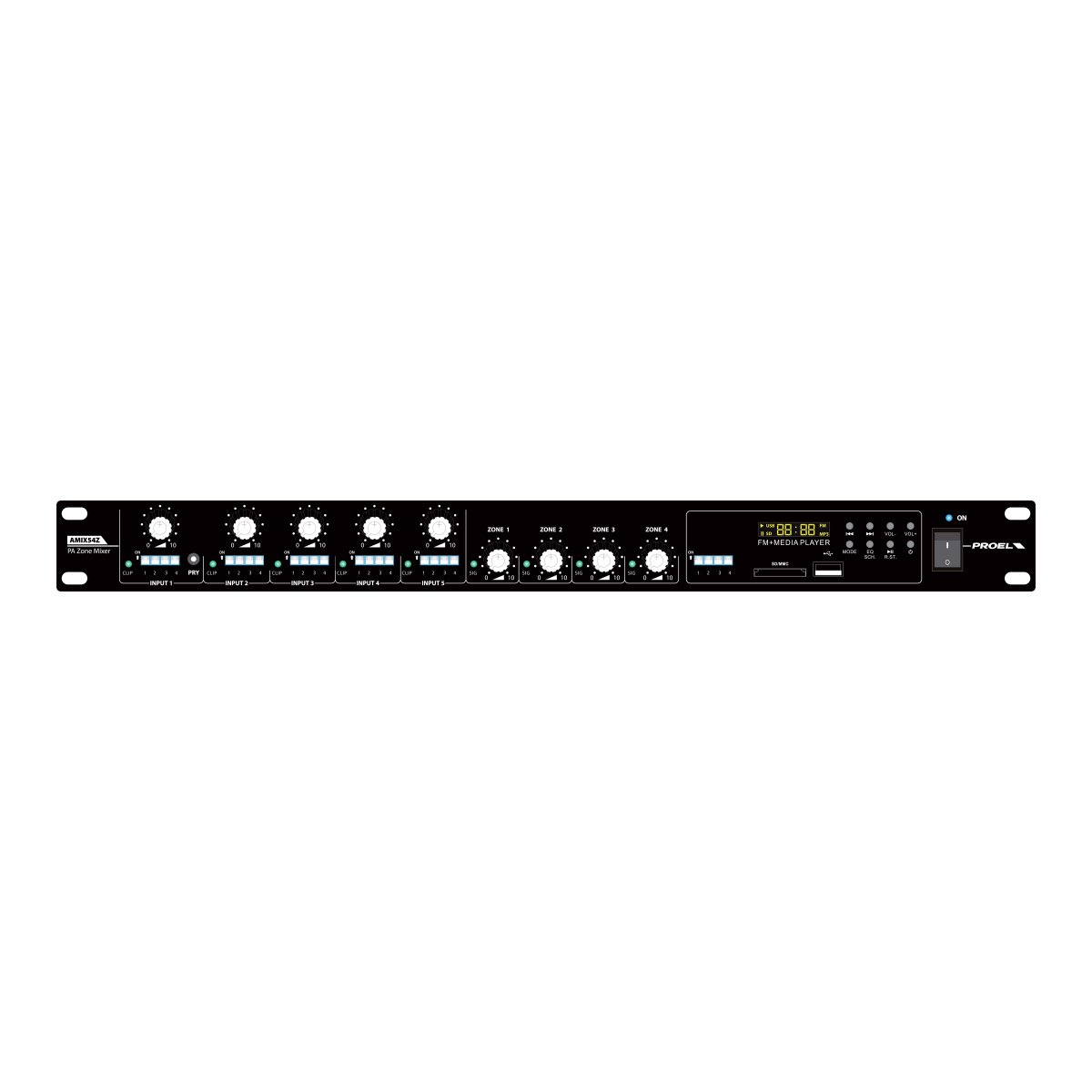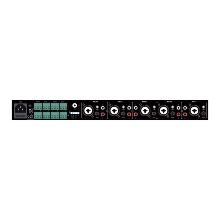L’AMIX5Z è una Matrice/Mixer Stereo provvista di 5 ingressi linea/micro con Phantom + 48V selezionabile. Ogni ingresso è liberamente assegnabile su una o gruppi di zone, l’ingresso 1 è anche dotato della funzione di priorità su tutti gli altri ingressi, tale funzione è inseribile mediante il comodo pulsante posto sul pannello frontale. Ogni ingresso dispone di un controllo di volume posto sul pannello frontale e di un controllo del livello di sensibilità posto nel pannello posteriore che uniti al connettore XLR COMBO e ai due RCA (STEREO) permettono di collegare a questo dispositivo, qualunque sorgente sonora sia essa a livello linea che micro.L’AMIX54Z è provvisto 4 uscite di zona Stereo su morsetti Eurobloc, ogni uscita dispone del proprio controllo di volume così da garantire il perfetto bilanciamento dei volumi con qualunque assetto di sorgenti audio collegate.Mediante il dip-switch posteriore ogni uscita può essere impostata su MONO o STEREO rendendo il dispositivo estremamente versatile sia in applicazioni puramente PA che applicazioni d’intrattenimento. Il LETTORE MULTIMEDIALE MP3 con radio FM (87.5÷108.0 MHz) integrata, liberamente indirizzabile sulle zone di uscita, , rende questo prodotto completo a tutti gli effetti ed estremamente vantaggioso nella maggior parte delle applicazioni.
