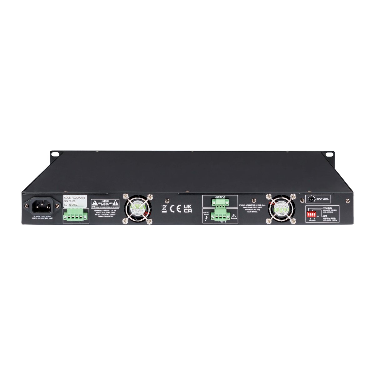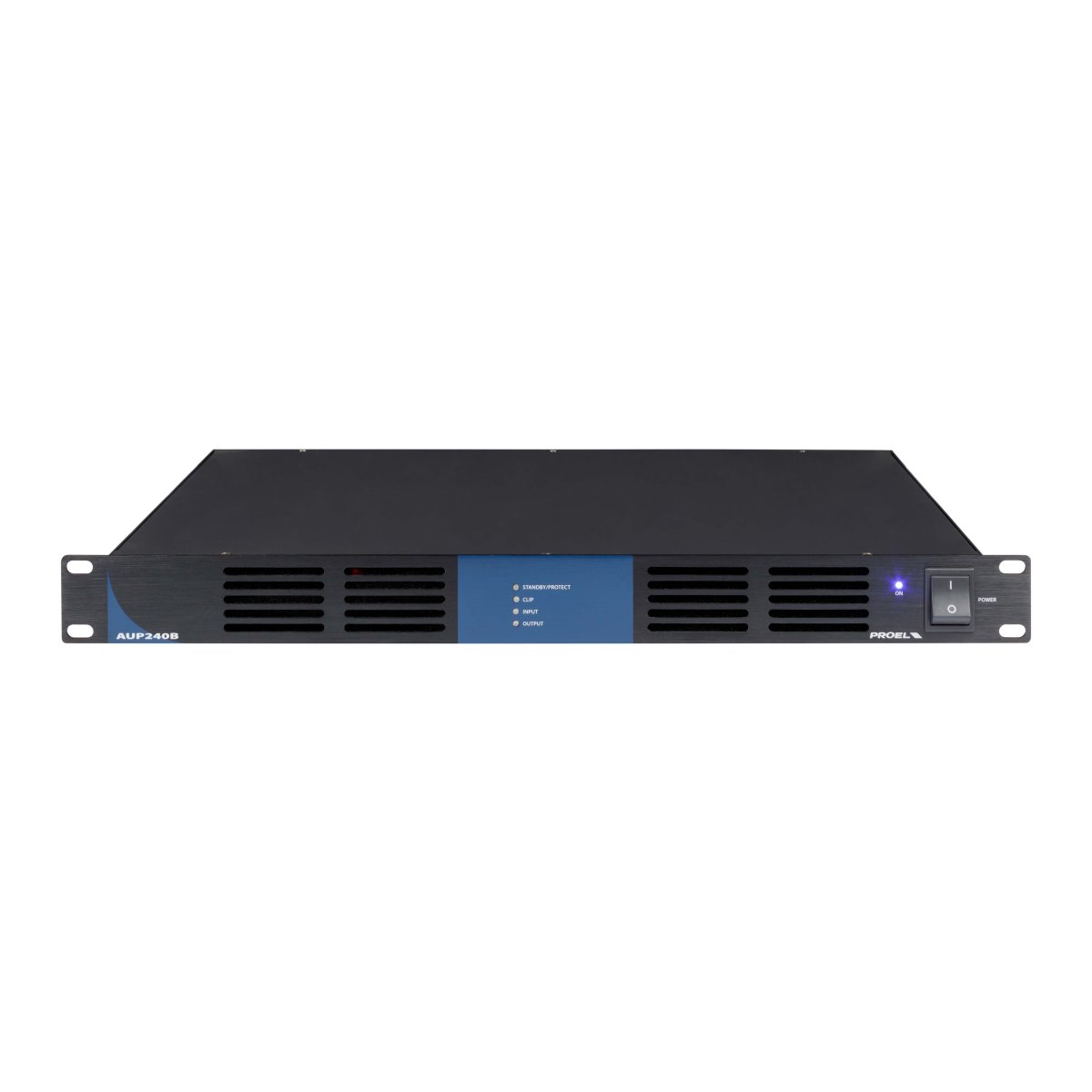L’amplificatore dipotenza in classe D AUP240B è dotato di alimentazione switching, una tecnologiache offre un consumo energetico minimo e una efficienza fino all’85%. L’AUP240Bha una potenza di uscita nominale di 240 W e può essere utilizzato con un mixero un preamplificatore per configurare un sistema di diffusione sonora. Leuscite per gli altoparlanti, sia ad alta impedenza 100 V che a bassa impedenza8 Ohm, consentono di soddisfare sia i requisiti di installazione fissa PA chedi installazione audio stereo Hi-Fi. L’ingresso di linea bilanciato è dotato diconnettore Euroblock e controllo del livello di ingresso. Il filtro passa-altointegrato in uscita può essere abilitato o disabilitato tramite dip switch. E’ presenteanche la funzione di abilitazione automatica dello standby dopo il mancatorilevamento del segnale di ingresso per un minuto e riattivazione immediata conrilevamento del segnale in ingresso. Gli indicatori a LED dello stato difunzionamento includono protezione, clip, ingresso e uscita per una facilesupervisione. Con protezione completa da cortocircuito, sovraccarico, altatemperatura, clip e CC, l’AUP240B risponde a precisi criteri di funzionamentoed è stato progettato e testato per garantire la massima affidabilità nell’usoprolungato.