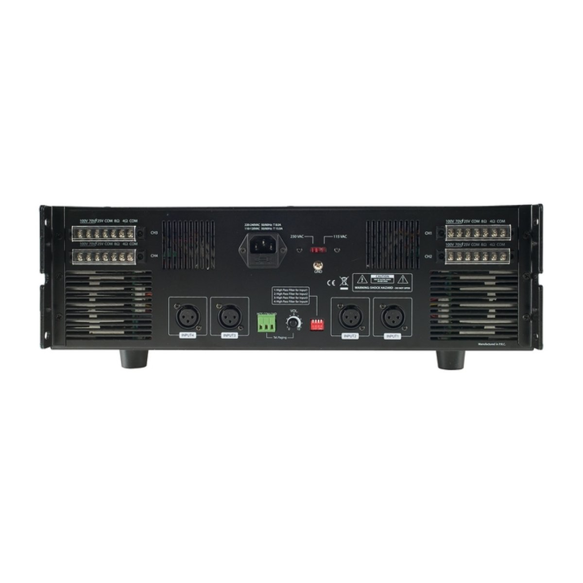 • Un ingresso di segnale bilanciato su connettore XLR.• Cinque uscite di cui due a impedenza costante (4/8ohm) e tre a tensione costante (25 – 70 – 100 V).• Indicatore di livello ed overload a led.• Un ingresso per chiamata da centrale telefonica con priorità VOX.• Controllo toni Bassi, Acuti e Master generale.• Filtro PA-HF inseribile posteriormente.• Selettore tensione d’alimentazione (117 – 230 Vca).