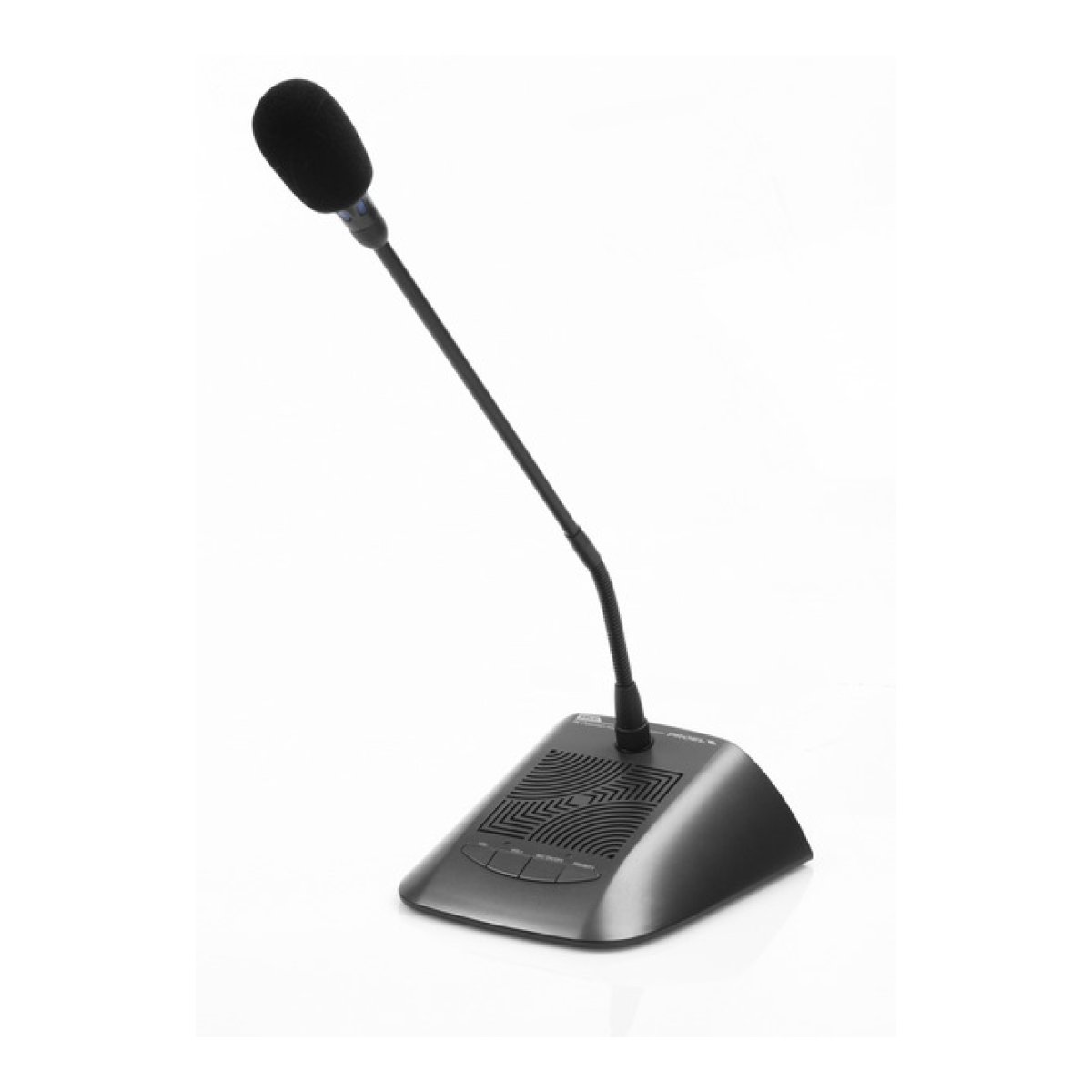 Unità microfonica Presidente dotata di tasto “PARLA”, tasto “PRIORITA’’ e led spia di funzioni attivate microfono a condensatore elettrete montato su stelo flessibile con anello luminoso, altoparlante di monitoraggio integrato con controllo di volume, presa cuffia. Cavo di connessione a Y in dotazione, lunghezza 2 mt. Order code : PA BMCD
