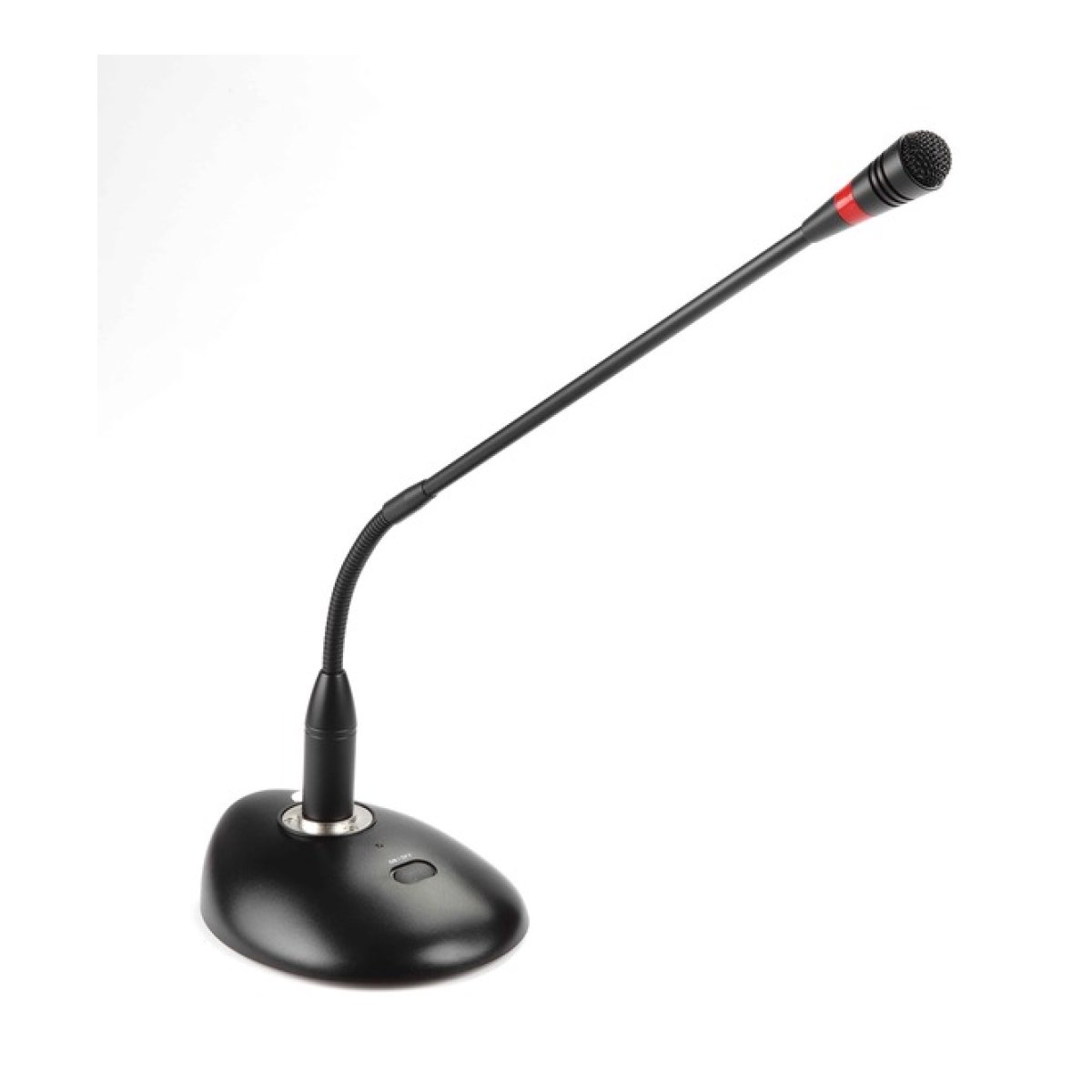Microfono professionale da tavolo, capsula a condensatore ad elevata sensibilità, stelo flessibile, anello luminoso per indicare la condizione operativa, interruttore on/off. Ottimale per tutte le installazioni PA, come conferenze, diffusione di annunci. Può essere alimentato tramite batterie o alimentazione phantom. La base ha in dotazione 8 metri di cavo XLRF-XLRM e un adattatore XLRF-Jack mono.