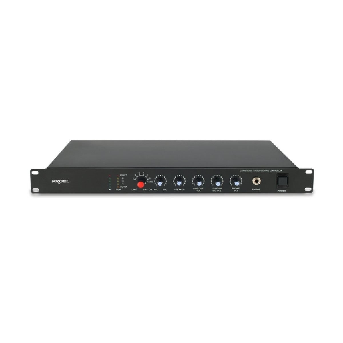 UNITA’ PRINCIPALE DI GESTIONE Unità principale per conferenza, permette la gestione senza operatore di sala di conferenze di piccolo e medio taglio, i partecipanti hanno la possibilità di ascoltare con estrema facilità lo svolgimento del dibattito tramite gli altoparlanti monitor presenti sulle postazioni microfoniche. Funzioni principali: – Alimentazione e controllo diretto di n° 45 unità microfoniche. – Tre modalità operative degli interventi : 1, 3 o 6 postazioni attive in contemporanea. – Ingressi di segnale MICRO e LINEA per unità esterne. – Uscite TAPE per registrazione e LINEA per amplificazione di sala. – Uscita cuffia con controllo di livello per monitoraggio. – Controllo livello sensibilità microfoni. – Controllo livello altoparlanti monitor delle unità.