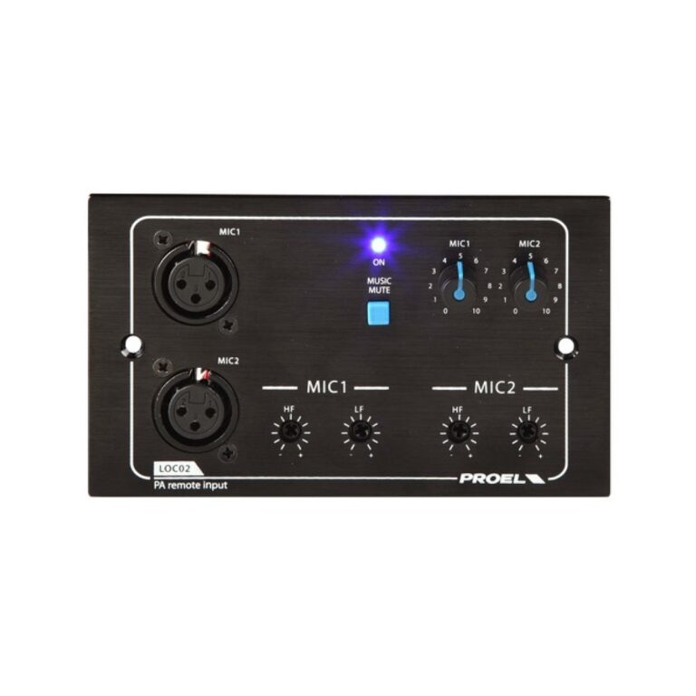 LOC02 è un pannello remoto a muro, dotato di due ingressi microfonici XLR, che funziona in combinazione con l‘unità centrale MATRIX88. Esso consente ai due microfoni collegati di operare nella zona audio a cui il controllo remoto è assegnato. Attraverso il tasto MUTE è possibile silenziare il programma musicale proveniente dall’unità centrale (MATRIX88) e consentire la riproduzione del solo segnale proveniente dai due ingressi microfonici. Per ogni ingresso microfonico il pannello consente la regolazione separata dei volumi e dei livelli di tono. Il collegamento tra pannello e matrice si realizza attraverso un cavo UTP CAT5, che viene anche utilizzato per alimentare il pannello per mezzo della matrice fino ad una distanza di 50 metri, per distanze superiori potrà essere necessario l’utilizzo di un’alimentazione (+ 24V DC) locale supplementare. LOC02 dispone di scatola da incasso a muro metallica dedicata.