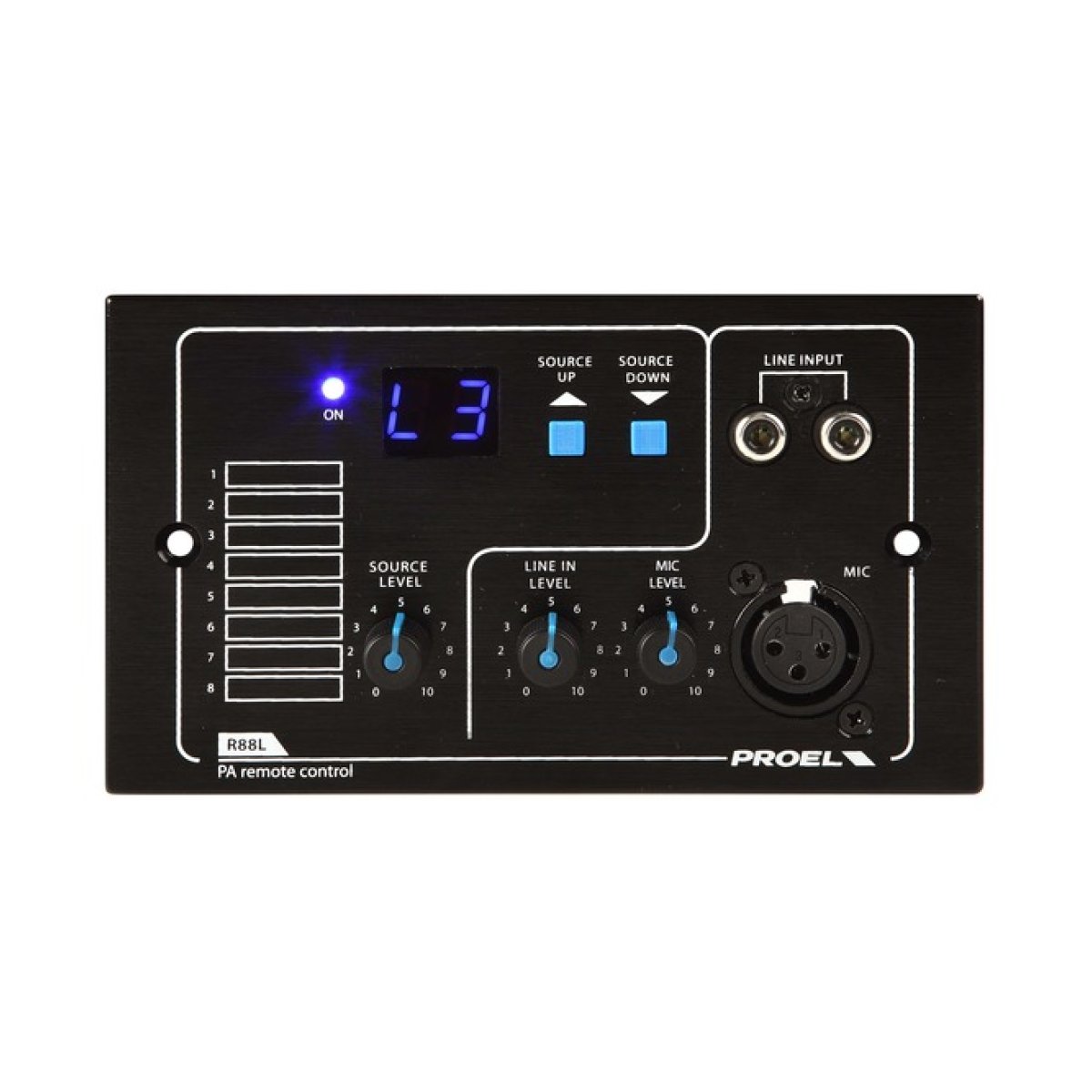 R88L è un pannello di controllo remoto a muro e funziona in combinazione con l‘unità centrale MATRIX88 nella zona audio a cui è assegnato. R88L viene utilizzato per il controllo del volume e per la selezione remota di uno tra gli 8 programmi musicali, la posizione di OFF e il canale Locale. R88L consente inoltre di inserire, nella zona audio a cui è assegnato, un ingresso di linea e un ingresso microfonico, entrambi provvisti di controllo di livello. Il pannello di controllo remoto dispone di un display a LED per fornire la visualizzazione diretta delle sorgenti selezionate le frecce servono per scorrere i canali di ingresso sonoro e le 8 etichette senza nome possono essere personalizzate dall’utente per individuare agevolmente la sorgente prescelta. Il collegamento tra pannello e matrice si realizza attraverso un cavo UTP CAT5, che viene anche utilizzato per alimentare il pannello per mezzo della matrice fino ad una distanza di 50 metri per distanze superiori potrà essere necessario l’utilizzo di un’alimentazione (+ 24V DC) locale supplementare. R88L dispone di scatola da incasso a muro metallica dedicata.