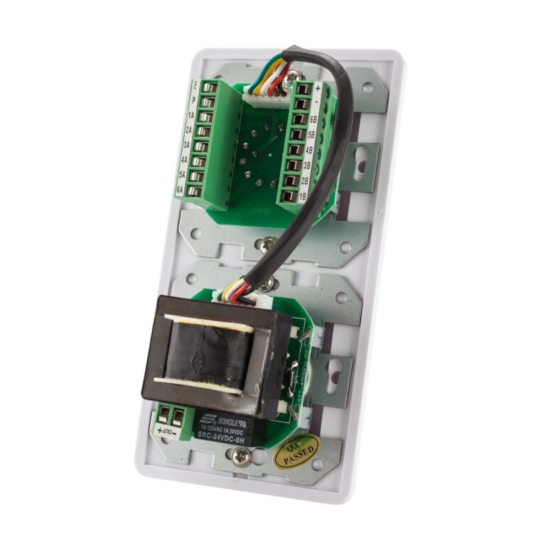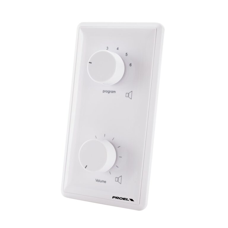 Selettore di 6 programmi PA con attenuatore di volume ad incasso su 11 posizioni per linee a 100V. Trasformatore da 12W per incasso su scatola dedicata. Completo con relè bypass 24Vdc.