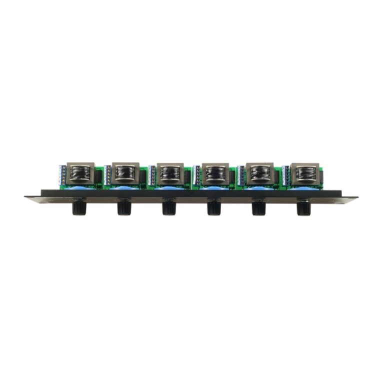 Questo pannello Rack 19′ è un regolatore di volume multiplo per n° 6 linee a 100V, con 100W di carico massimo ciascuna.