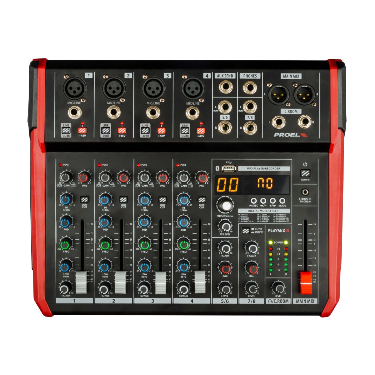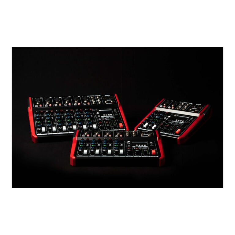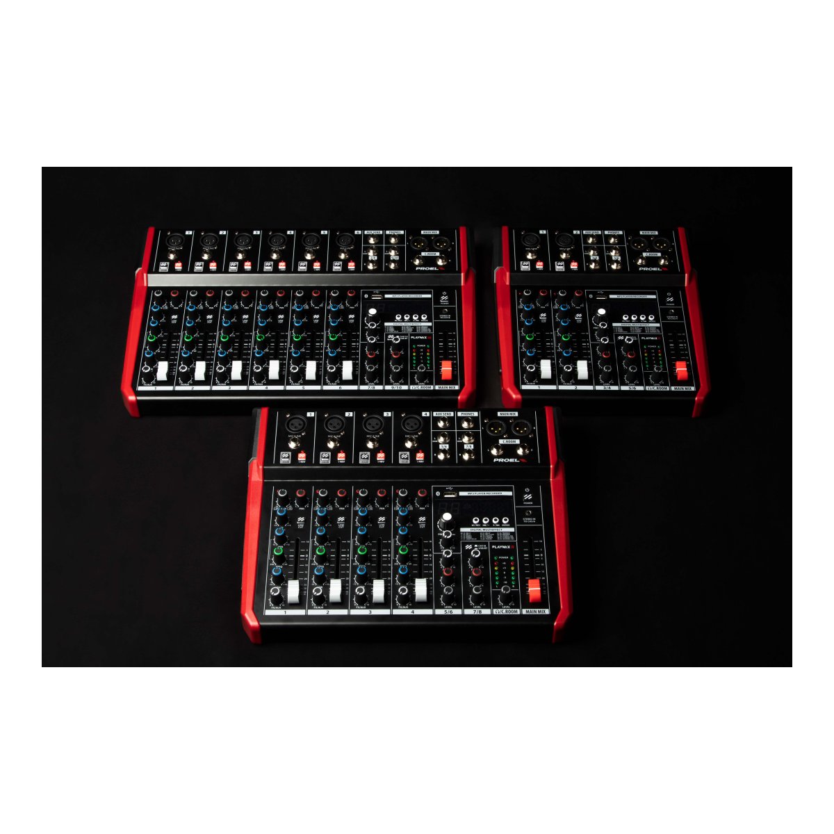 I mixer PLAYMIX sono disponibili in 3 modelli, con le stesse funzioni di canale e master, ma con 6, 8 e 10 canali rispettivamente. I canali mono MIC/LINE includono preamplificatori microfonici a basso rumore e ad alta dinamica, equalizzatori a tre bande con MID parametrici e filtro HPF, e fader da 60 mm per un controllo completo del suono.